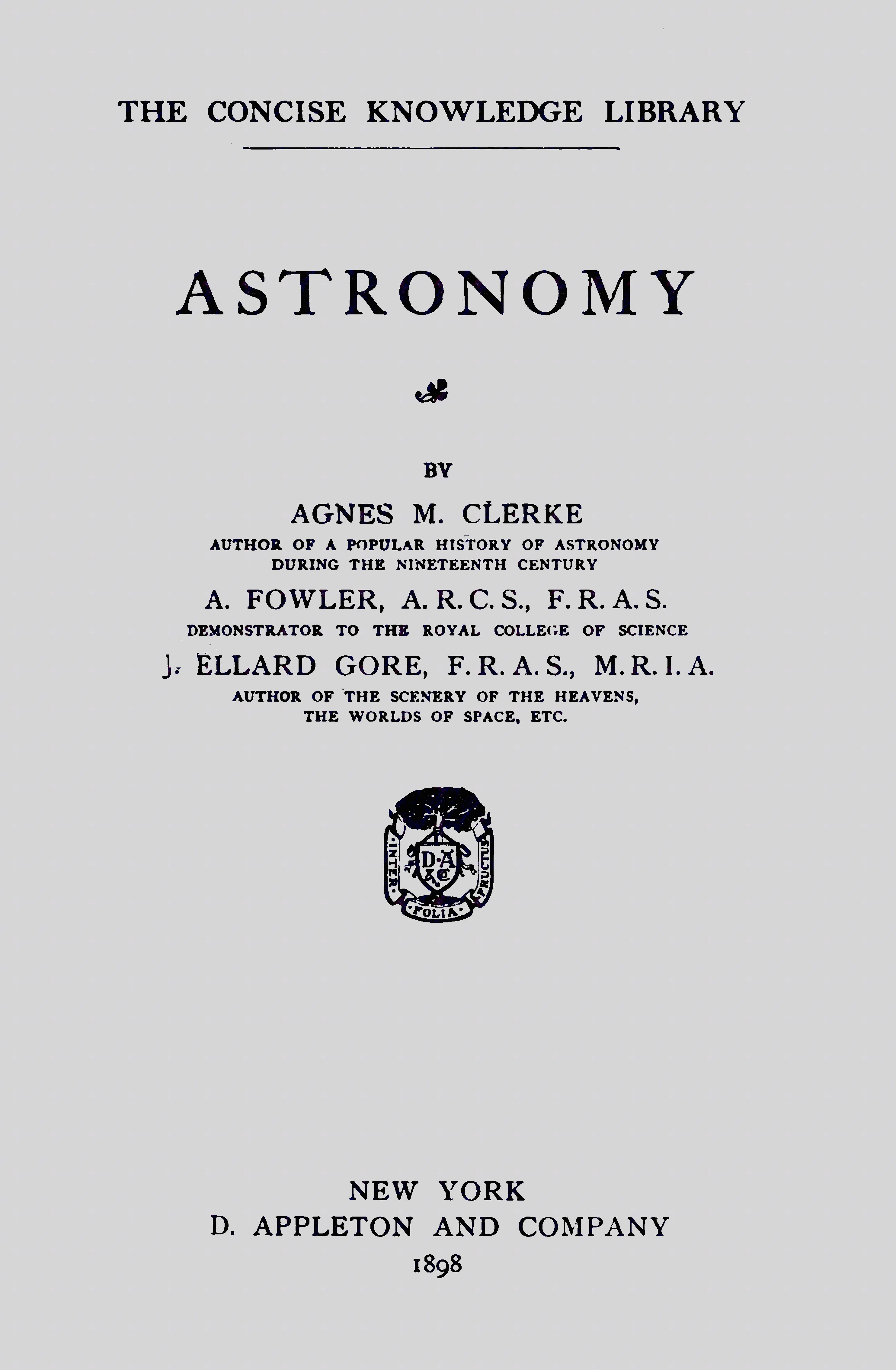 In Section I., Miss Agnes M. Clerke, author of “A Popular History of Astronomy during the Nineteenth Century,” gives a brief historical sketch of the science from Hipparchus to the present time. In Section II., an attempt is made by Mr. A. Fowler, A.R.C.S., F.R.A.S., Demonstrator of Astronomical Physics to the Royal College of Science, to briefly outline the general principles of spherical and gravitational Astronomy, and to describe the instrumental means now at the command of observers in the various branches of Astronomical research. The author begs to record his indebtedness to Loomis’ “Treatise on Astronomy,” and Young’s “General Astronomy,” which have been frequently consulted, especially for memorial data; to Mr. W. Shackleton, for assistance in proof-reading; and to Mr. C. P. Butter, for valuable help in preparing the diagrams. Section III., contributed by Miss Agnes M. Clerke, deals with the Solar System; and Section IV., written by Mr. J. Ellard Gore, F.R.A.S., M.R.I.A., treats of the Sidereal Heavens.