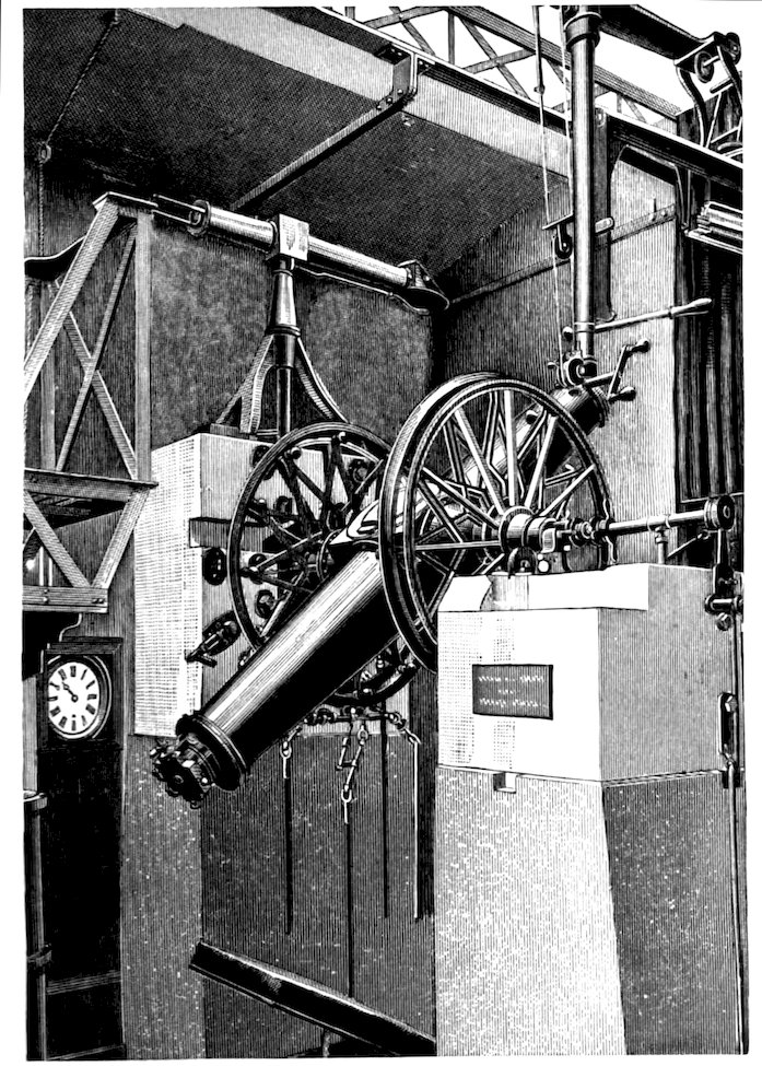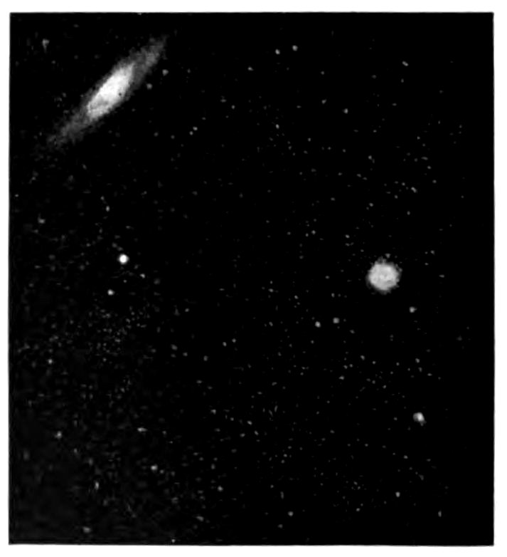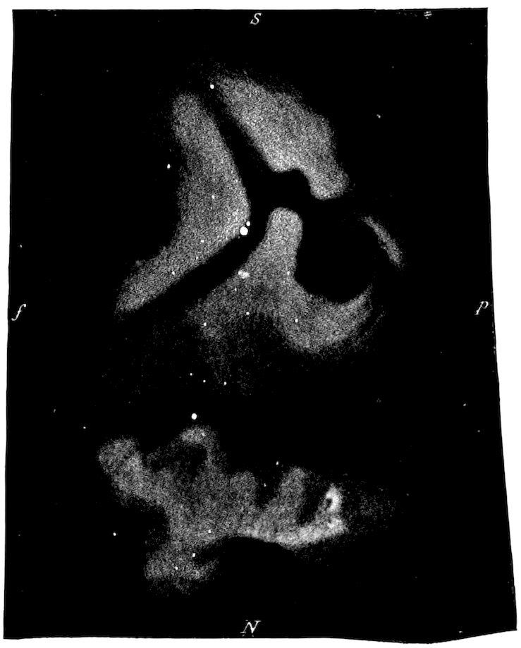 To M. Loewy, Director de l’Observatoire, Paris, for permission to reproduce the photograph of the Moon, which forms the frontispiece of this volume; to Professor Edward S. Holden, Director of the Lick Observatory, for permission to reproduce drawings and photographs of the Observatory at Nice, p. 2; the Thirty-six Inch Reflector of Lick Observatory, p. 40; the Meridian Circle of the Paris Observatory, p. 203; the Spectroscope adapted to the eye end of the Lick Telescope, p. 221; and Jupiter showing the Red Spot, p. 322; to Dr. Isaac Roberts, for permission to reproduce his photograph of the photographic telescope used by him, p. 196; to Messrs. Trichnor & Co., of Berlin, for permission to reproduce two illustrations of Donati’s Comet, pp. 228 and 363; and one of Sun-spots and Magnetic Variations, p. 246—all from Langley’s “New Astronomy”; to Messrs. Witherby & Co., for permission to reproduce the photograph of a Sun-spot by Janssen, p. 243; the photograph of Jupiter, p. 328; the photographs of Swift’s Comet, pp. 374 and 375, Brooks’ Comet, p. 381, and the Milky Way, p. 557, from Knowledge; to Messrs. Taylor & Francis, for the diagram of curves showing the development of Sun-spots, p. 257; to Professor George E. Hale, of Kenwood Observatory, Chicago, for his illustrations of Eruptive Prominences photographed at Kenwood, March 24th, 1896, pp. 264 and 265, reproduced from the Astrophysical Journal; to the Council of the Royal Society, for the illustration of the Eclipsed Sun, p. 267, reproduced from “Philosophical Transactions”; to Professor Barnard, for the photographs of the Corona, reproduced on p. 269; and the ixdrawings of the Transit of Jupiter’s Satellite, on p. 330, reproduced from the Monthly Notices of the Royal Astronomical Society; the Eye of Mars, p. 302; and of Saturn and his Rings, p. 335; to the editor of the Astronomische Nachrichten, for the map of Mercury, by Schiaparelli, reproduced on p. 276; to the editor of Nature, for the drawing of Venus by Mascari, on p. 280; to Messrs. George Philip & Son, for the map of the Moon, given on p. 291, from Fowler’s “Telescopic Astronomy”; to Messrs. Longman, Green & Co., for the Chart of Mars, p. 300, and the diagram of the Apparent Orbit of the Companion of Sirius, p. 439, from Proctor’s “Old and New Astronomy”; to Professor W. W. Payne of Goodsell Observatory, for the use of the drawing of the Oases of Mars, p. 304, from “Popular Astronomy”; and the photograph of Holmes’ Comet, p. 378, from the same work; to Messrs. A. & C. Black, for the illustrations of the Great Comet of September, 1882, p. 361, reproduced from Miss Clerke’s “History of Astronomy”; to Messrs. Crosby, Lockwood & Co., for permission to reproduce the illustration of the Nebula in Andromeda 31 Messier, p. 398, from the frontispiece of Mr. J. E. Gore’s “Visible Universe”; and also for the same authority, regarding the diagrams, showing the Stars visible in the Northern Hemisphere, p. 401; the Stars visible in the Southern Hemisphere, p. 403; the drawing showing the position of the Solar Apex, according to different computers, p. 429; and the photographs of the Spiral Nebula 51 Messier, p. 533; and the Milky Way in Sagittarius, p. 555, all from the same work; to Messrs. A. D. Innes & Co., for the use of the diagram, Apparent Orbit of Zeta Herculis, p. 436; Triple Stars, p. 451; and for permission to reproduce the photographs, 37 Messier, p. 505; the star cluster, Omega Centauri, p. 512; the Nebulæ of Orion, p. 521; and the Magellanic Clouds, p. 537, from “The Worlds of Space”; and to Messrs. Sutton & Co., for the use of the diagram xof the Apparent Orbit of 70 Ophiuchi, p. 443; the photographs of the Double Cluster of Perseus, p. 503; the Star Cluster in Gemini, p. 504; the Star Cluster in Hercules, p. 507; and the drawing of the Trifid Nebula, Sagittarius, p. 525, from “The Scenery of the Heavens”; and the drawing of the Temporary Star of 1572, p. 481, from “Planetary and Stellar Studies,” both published by them.