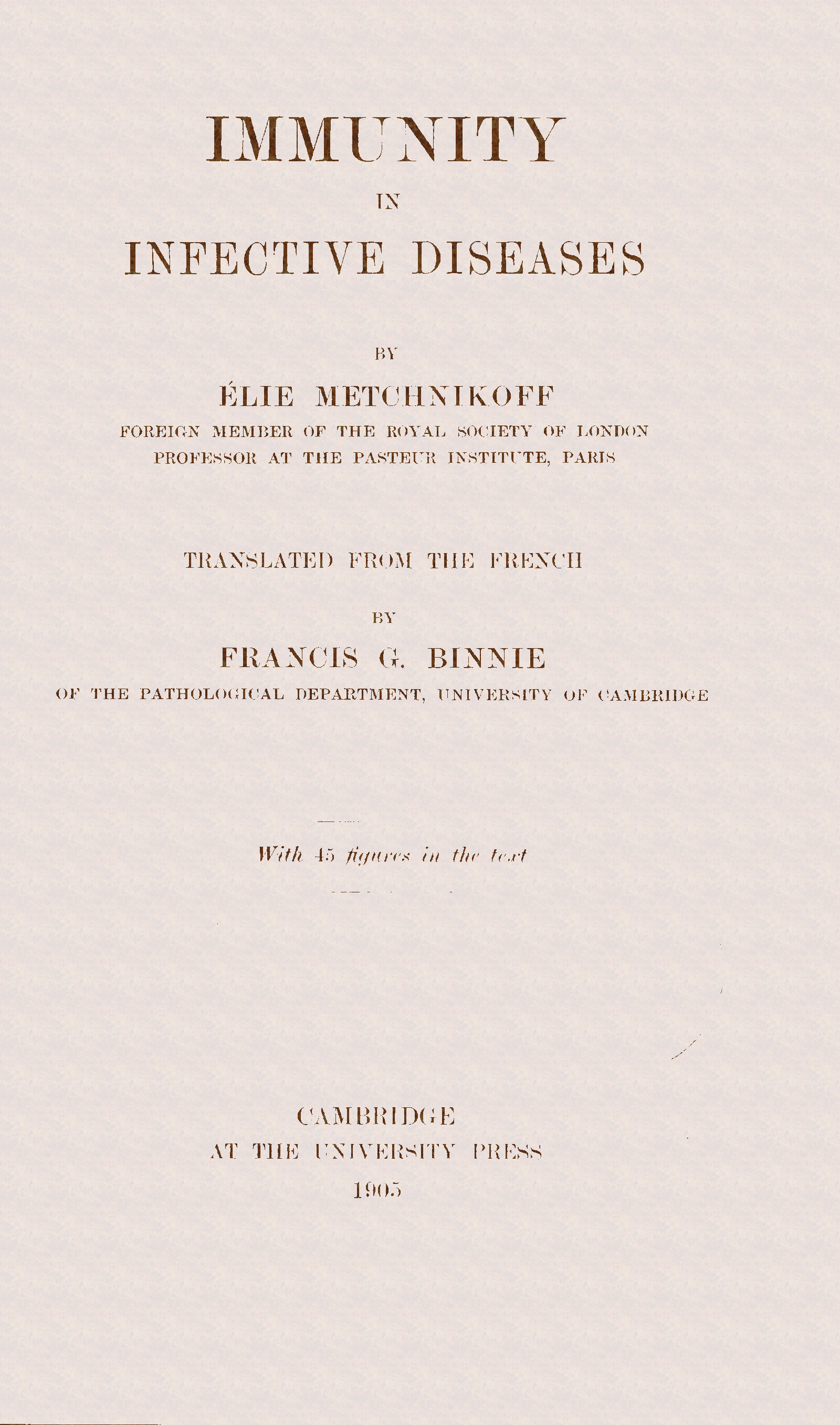 Convinced that many of the objections raised against the phagocytic theory of Immunity proceeded solely from an insufficient knowledge of the theory, I thought that a work condensed into one volume might render some service to those who are interested in the problem of Immunity. I do not know whether I shall convert my opponents, but I am convinced that a perusal of this book will clear away certain misunderstandings. A very competent observer recently confessed in one of his publications that for many years he had been unaware of the experiments of M. J. Bordet and myself on Immunity against the cholera vibrio, experiments which he now xregards as of fundamental importance for the comprehension of the whole question of Immunity. I hope that after the appearance of this treatise such oversights will not be so likely to occur.