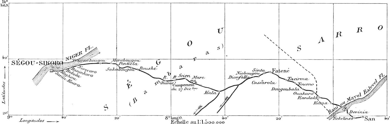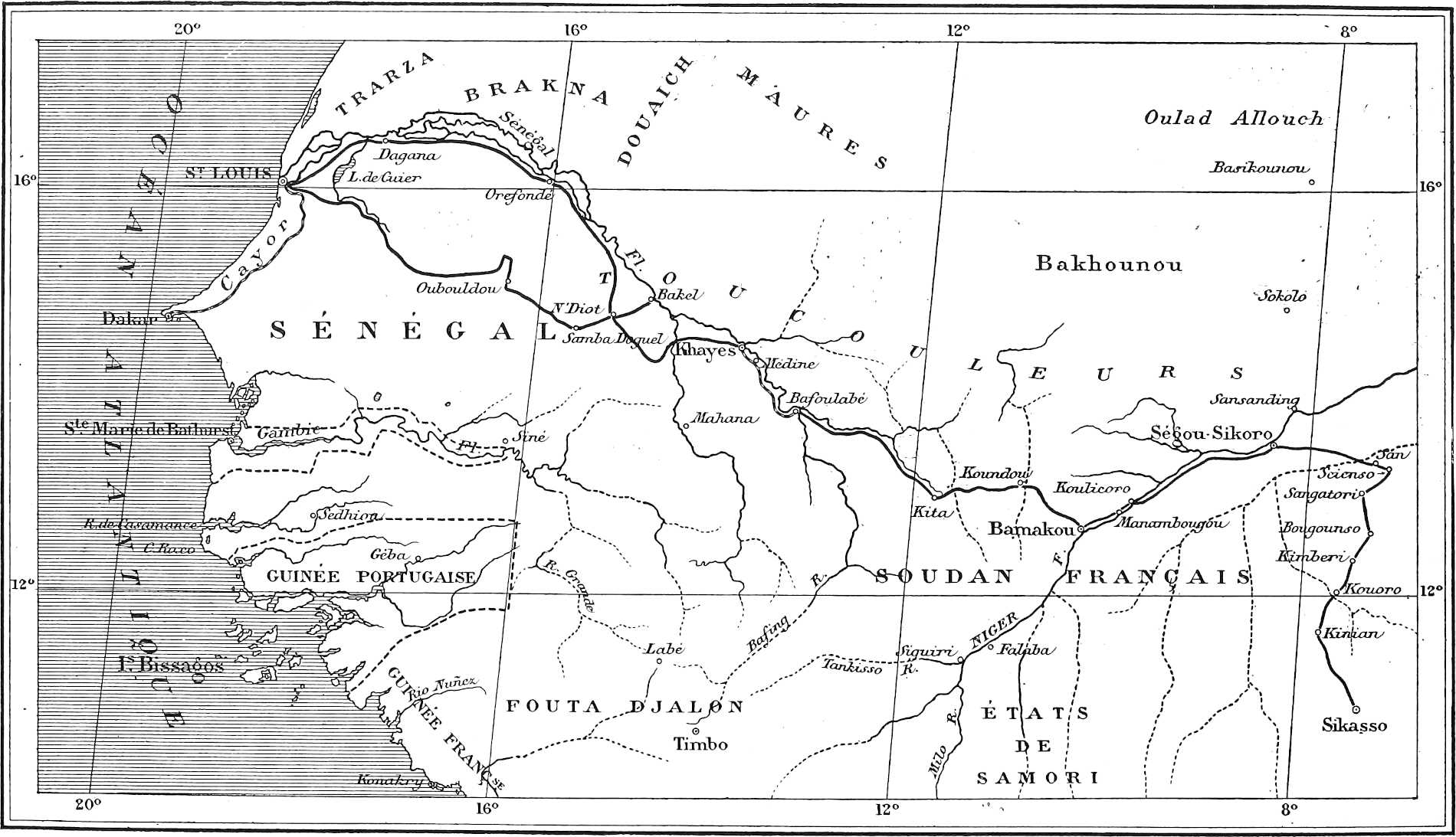 Avec dix hommes armés on doit traverser l’Afrique. — Stanley et le Soudan égyptien. — M. Étienne et les instructions de la mission. — Badaire. — Départ de France. — Dakar. — Saint-Louis. — Khayes. — La traversée du Soudan : Bafoulabé, Kita, Koundou, Bamakou. — Koulikoro. — Le convoi par le Niger ; le convoi par terre. — Nyamina, Ségou. — Séjour à Ségou ; les derniers préparatifs.