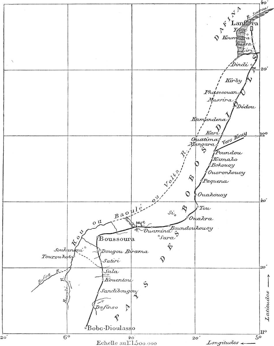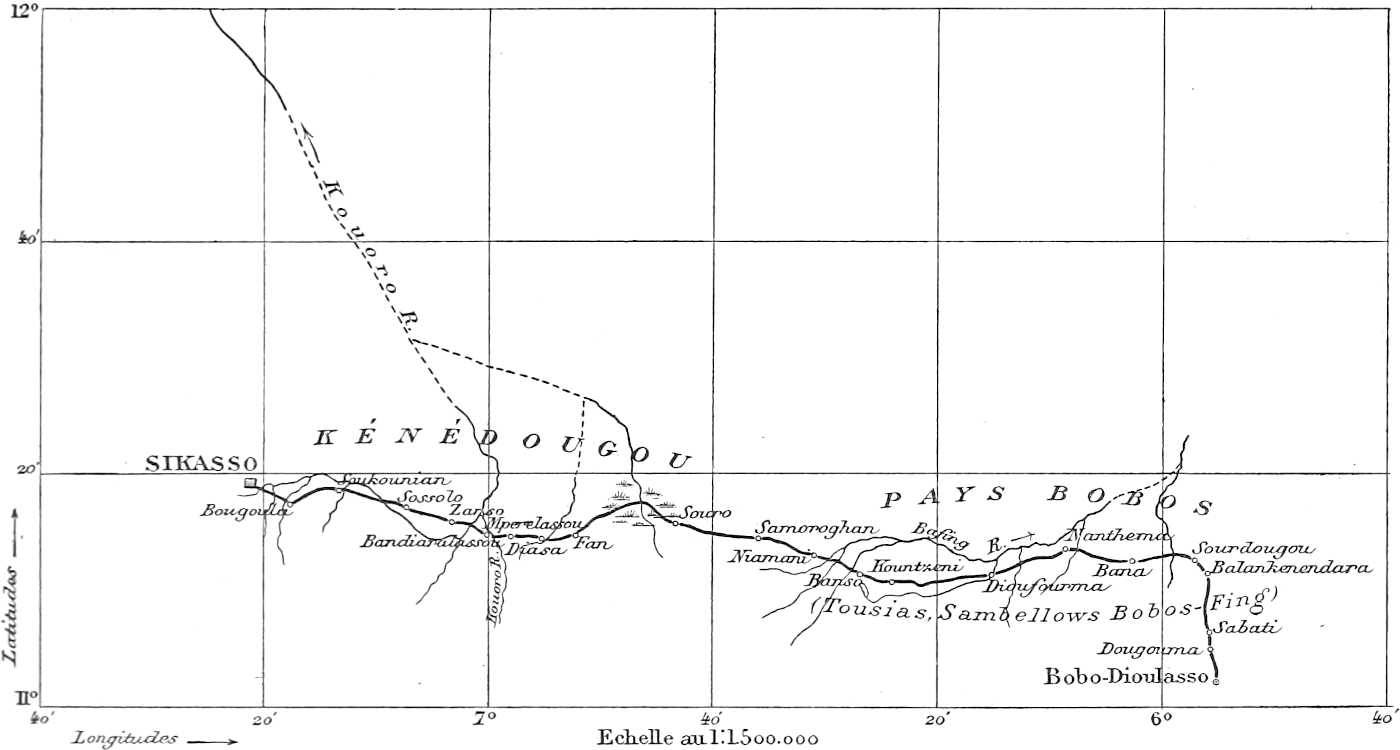 Toutefois, ainsi que nous le verrons par la suite du récit, foule de[9] petits États ou de groupes indépendants de villages existent dans l’intérieur, dont la traversée est souvent plus difficile pour le voyageur que celle des grands empires nommés ci-dessus ; très souvent aussi ils sont en hostilité les uns vis-à-vis des autres. Dans de telles conditions, à l’improviste une attaque peut prendre naissance ; mais j’avais eu soin de prévoir la conduite à tenir. J’emportais les outils de terrassement et de défrichement nécessaires à la construction rapide d’un poste ; une entreprise sur un village m’eût donné les ressources en vivres pour tenir un mois ou deux, vu le peu de bouches que j’aurais eu à nourrir, et je pouvais présumer que des négociations habilement engagées m’auraient permis de me sortir de situation en m’ouvrant la route.