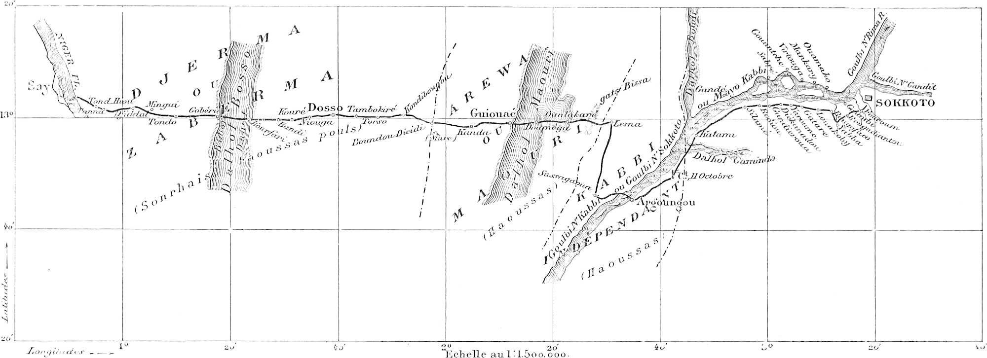 [17]Je dis était, parce que, depuis mon passage, ces régions comprises entre Sokkoto et le Niger sont rentrées sous l’autorité de l’Empereur haoussa, à la suite de la prise d’Argoungou.