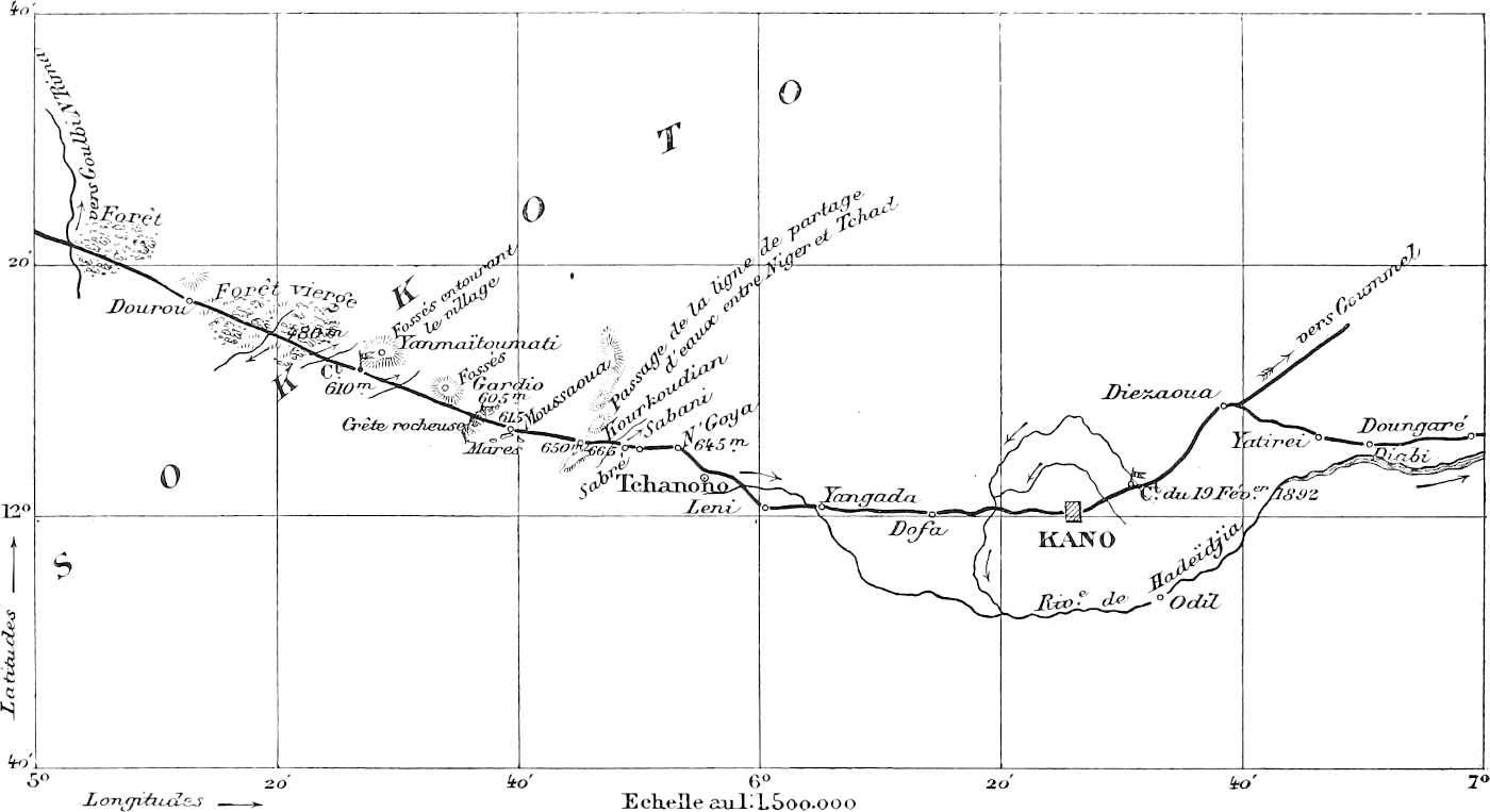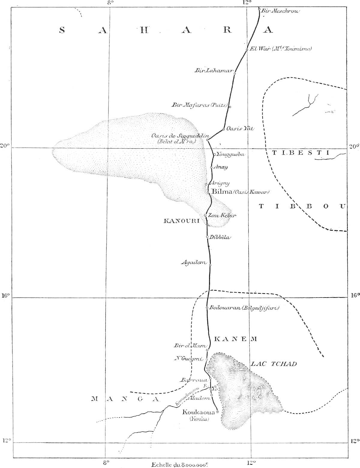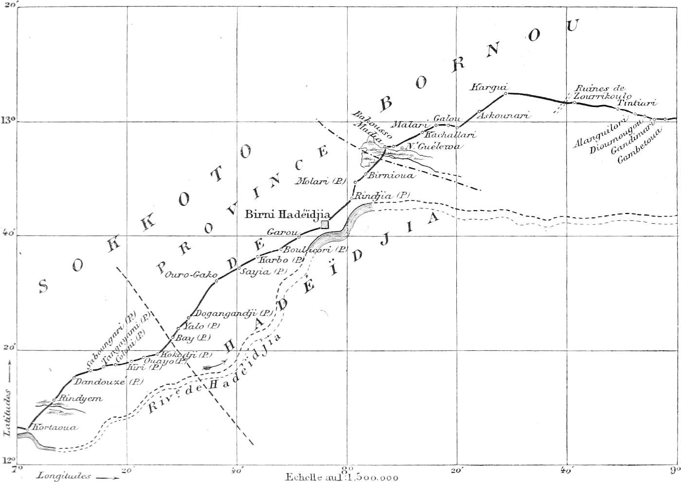 Ces régions n’avaient guère été visitées depuis le célèbre voyageur allemand Barth. Seuls Fleyel et plus tard Staundinger et Ernst Hartret, son compagnon, avaient atteint Sokkoto en venant du Sud. Le Bornou, Kouka du moins et les États situés au sud et à l’est du Tchad, avaient été visités de 1870 à 1873 par le célèbre voyageur, Allemand aussi de nationalité, Nachtigal. Je ne dois pas omettre non plus le voyage au Bornou de Ghérard Rholfs, en 1867.