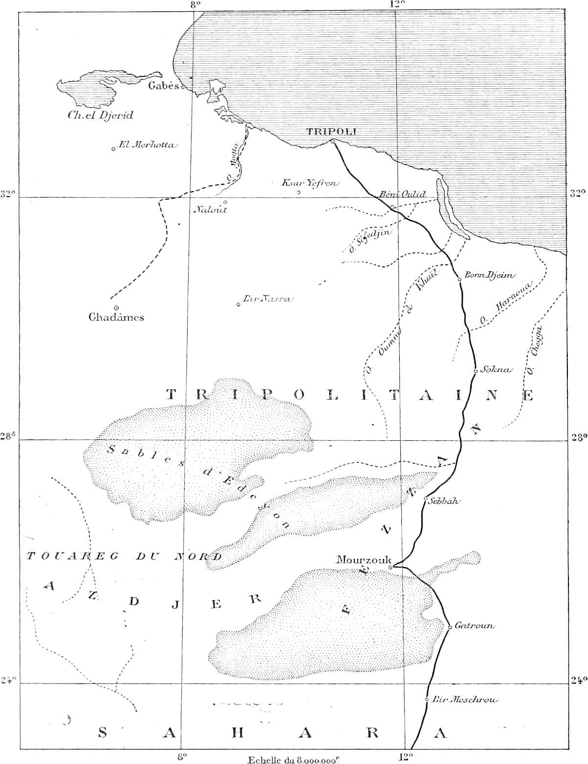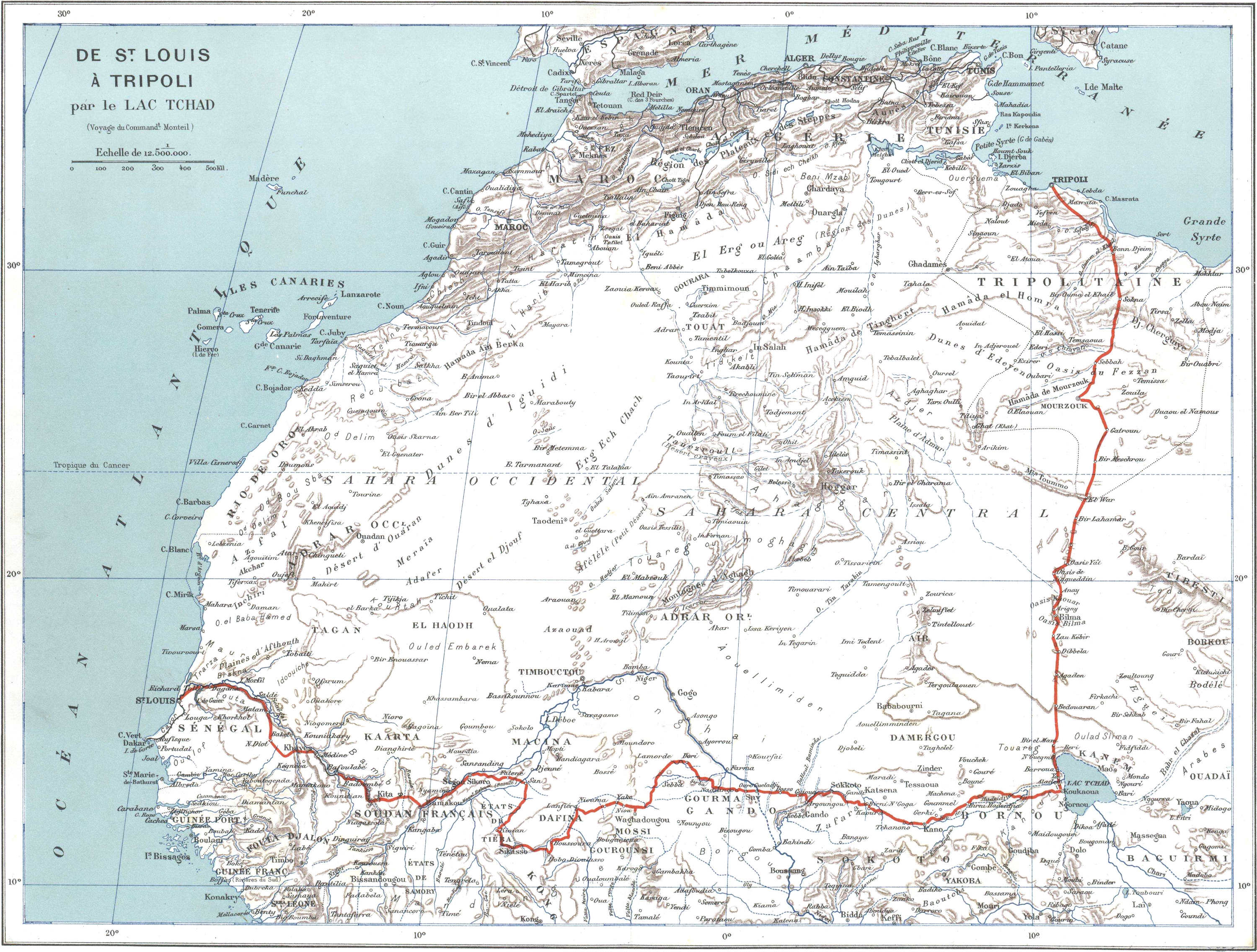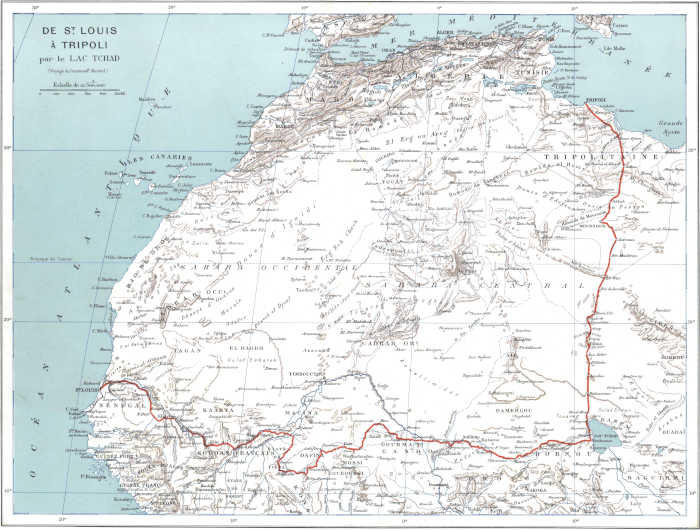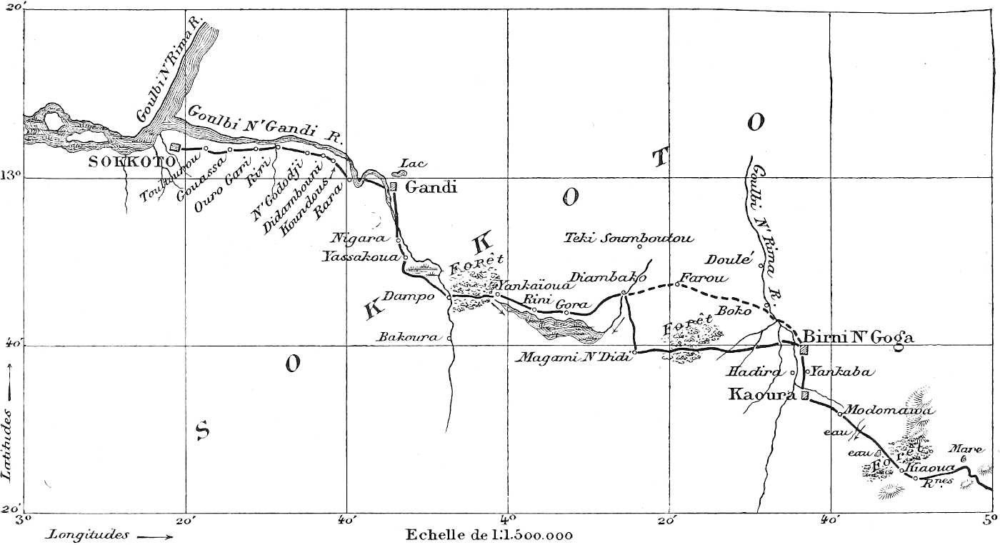 Ces régions n’avaient guère été visitées depuis le célèbre voyageur allemand Barth. Seuls Fleyel et plus tard Staundinger et Ernst Hartret, son compagnon, avaient atteint Sokkoto en venant du Sud. Le Bornou, Kouka du moins et les États situés au sud et à l’est du Tchad, avaient été visités de 1870 à 1873 par le célèbre voyageur, Allemand aussi de nationalité, Nachtigal. Je ne dois pas omettre non plus le voyage au Bornou de Ghérard Rholfs, en 1867.