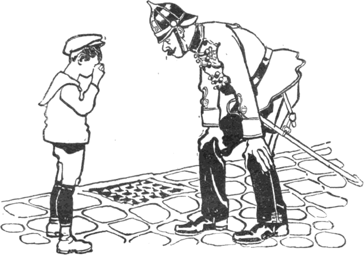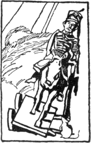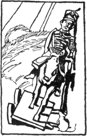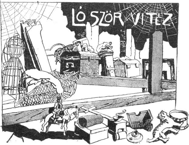Kezembe vettem a huszárt s megtisztítottam a portól és a pókhálótól. Az idő ugyancsak megviselte. Arca förtelmesen össze volt mázolva, orra hiányzott; kopott, foszladozó egyenruhája alól itt is, ott is előbukkantak a drótbordák és a lószőrtöltelék; – hanem azért a kétarasznyi legény merev szemével keményen és marconán tekintett rám, mint egy rokkant vitézhez illik, ha huszonöt év mulva viszontlátja régi generálisát.