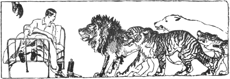 Félóra múlva azonban fölébresztette valami. Nagy morgást, korgást, cammogást és sziszegést hallott, hogy megrendült bele az egész kaszárnya. Az ajtó kipattant és bejöttek a hálótársai. Ugyancsak furcsa kompánia volt. Elsőnek egy irgalmatlan nagy himoroszlán robogott a szobába, hangos hördüléssel. Aztán óriás fehér medve cammogott be. Majd puha macskatalpon beszökött egy izzószemü tigris. A tigrist lompos nagy hiéna, a hiénát párduc követte nyomon. És még egyre jöttek a fenevadak. Vadkan és farkas is volt köztük. Összesen tizenketten voltak. Mint sereghajtó hatalmas csörgőkígyó kúszott a szobába.