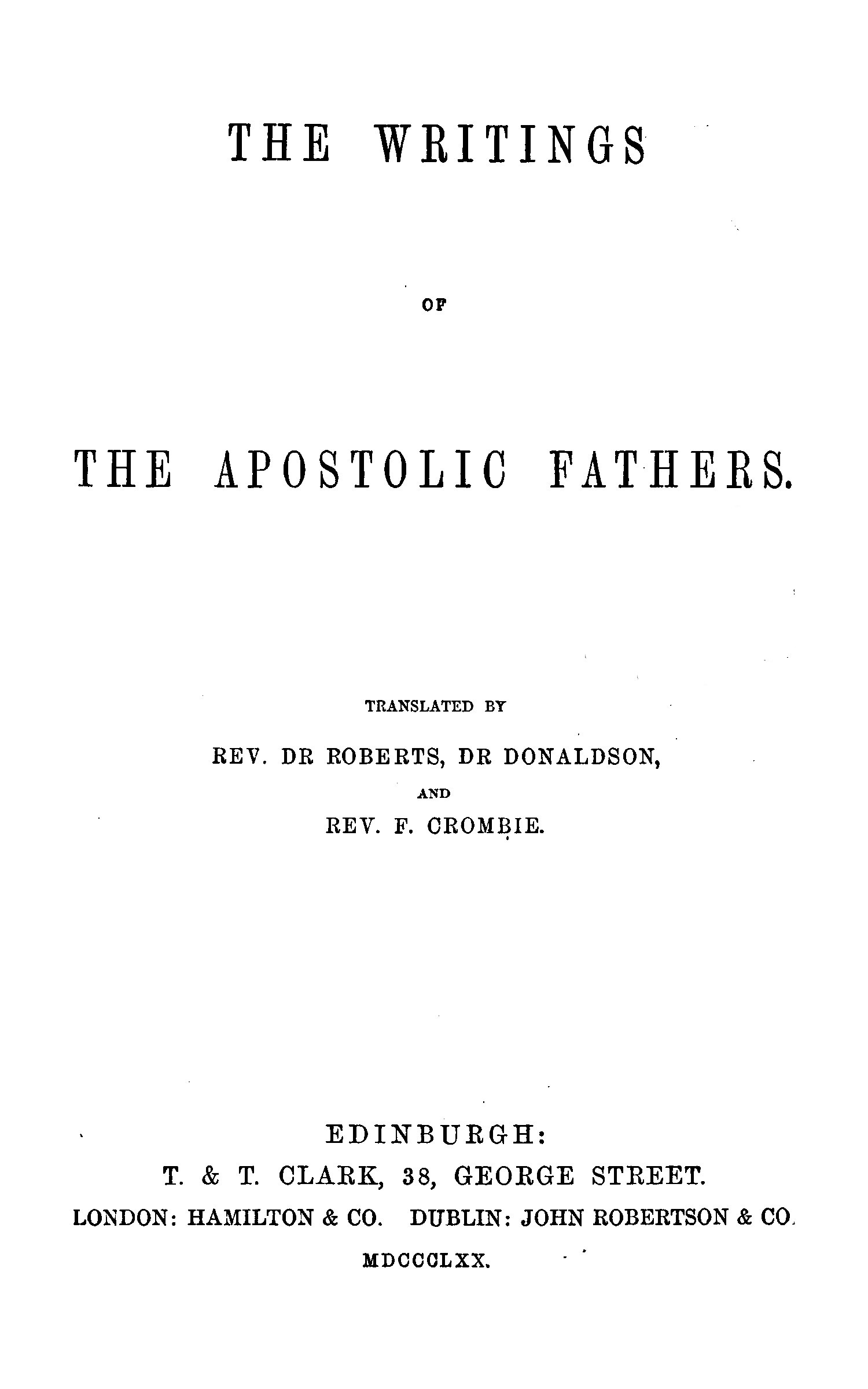 The present volume has been translated by the Editors (with the exception of the Similitudes of Hermas, which is translated by the Rev. F. Crombie, M.A.). Their object has been to place the English reader as nearly as possible on a footing of equality with those who are able to read the original. With this view they have for the most part leaned towards literal exactness; and wherever any considerable departure from this has been made, a verbatim rendering has been given at the foot of the page. Brief introductory notices have been prefixed, and short notes inserted, to indicate varieties of reading, specify references, or elucidate any obscurity which seemed to exist in the text.