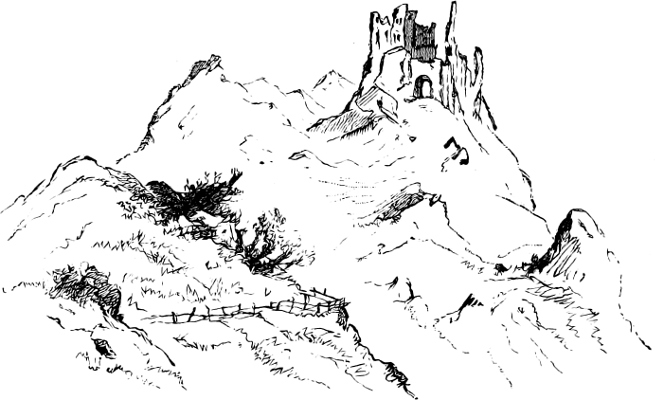 The scene which now presents itself to our view is surely one of the most magnificent in the world. On either side are lofty crags, which rise precipitously out of the raging waters. On the topmost crest of that to the left stands the ruined stronghold of a robber-knight, now abandoned to eagles; whilst a little lower down, on the right bank, crowning the summit of an almost inaccessible rock—the two having once held the keys of the Pass—stand the splendid but crumbling ruins of the feudal castle of Golumbacz, with its nine towers and battlemented walls dominating the river. Its name is said to be a corruption of “Columba” (the castle of the Dove), for it was here that the Greek Princess Helena was imprisoned.