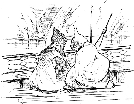 Their faces are fronting up stream, and I wonder whether her thoughts are still travelling in the direction of the little, sandy, sun-burnt port where her lover dwells, and whether he too is casting regretful glances down the river’s course, or whether, on the contrary, he is whiling away the tedium of the evening and consoling himself in the presence of some other fair one!