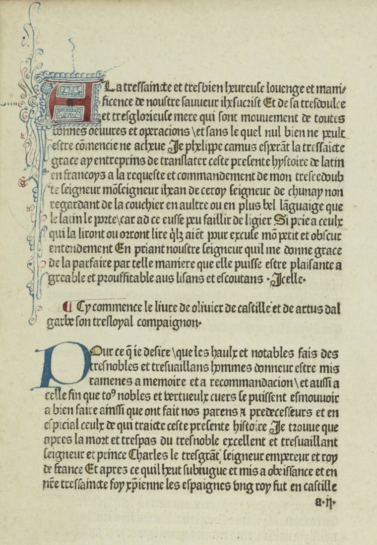 A la tressaincte et tresbienheureuse louenge et manificence de noustre sauveur jhesucrist Et de sa tresdoulce et tresglorieuse mere qui sont mouvement de toutes bonnes oeuvres et operacions/ et sans lequel nul bien ne peult estre commencié ne achevé Je phelippe camus esperant la tressaincte grace ay entreprins de translater ceste presente hystoire de latin en françoys a la requeste et commandement de mon tresredoubté seigneur monseigneur jhean de ceroy seigneur de chunay non regardant de la couchier en aultre ou en plus bel languaige que le latin le porte/ car ad ce eusse peu faillir de ligier Si prie a ceulx qui la liront ou orront lire qu’ilz aient pour excuse mon petit et obscur entendement En priant noustre seigneur qu’il me donne grace de la parfaire par telle maniere que elle puisse estre plaisante agreable et prouffitable aus lisans et escoutans. Icelle.