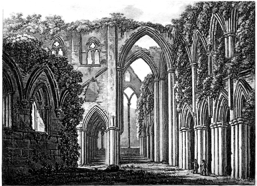 On entering this sublime ruin the mind is struck with a reverential and religious awe: a sensation which can be no more expressed by words, than it can in this full extent be excited by all the graces of Grecian 138proportions, and all the decencies of orthodox worship. The noble clustered columns form a beautiful scene in perspective; and, while some of the rich Gothic ornaments and pointed arches above, present themselves as if magically suspended, and raise an idea of grandeur, accompanied, if not with alarm with some degree of surprise, the various ruinated fragments of capitals and pillars below, which lie scattered indiscriminately and in part overgrown and buried in beds of wild flowers and verdant tendrils, create an interesting disorder, and suggest ideas, though perhaps of a melancholy tinge, yet so far from a distressing nature as to lull the mind to a repose, congenial to the general turn of the surrounding scenery.