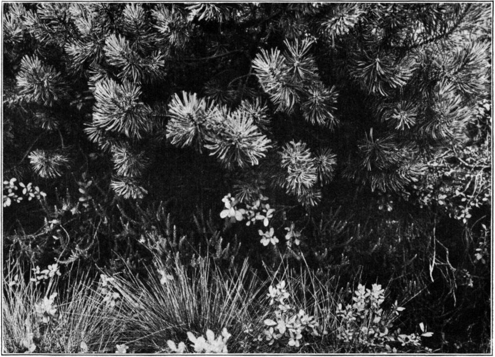 Flachmoore begleiten meist Stromtäler. Zu ihnen darf man rechnen den Spreewald, das Oderbruch, das Lebamoor in Pommern und die ausgedehnten Erlenmoore am kurischen Haff. Sie alle werden teils abgebaut auf Brenntorf oder wurden und werden umgewandelt in Kulturland. Austrocknende Moore werden meist in Besitz genommen von Sträuchern: in Norddeutschland östlich der Elbe von Strauchbirke (Betula humilis), von Gagelstrauch [49]Myrica Gale, von Sumpfporst; oder von Zwergsträuchern: Trunkelsbeere Vaccinium uliginosum, Heidel- und Preißelbeere, auch von Krähenbeere Empetrum nigrum (Abb. 13). Vor allem das Heidekraut (Calluna vulgaris) mit seiner unverwüstlichen Lebenskraft überzieht schließlich jene Moorgebiete besonders bei sandig-grusigem Untergrund, während in bruchigem Gelände, zumal im Nordwesten unseres Vaterlandes, in der Lüneburger Heide, die reizvolle Glockenheide Erica tetralix sich ansiedelt, und der Wacholder (Machandelbaum, Knisterbusch) Juniperus communis seine dunklen Säulenpyramiden baut, um der Landschaft einen lieblich herben Reiz zu verleihen.