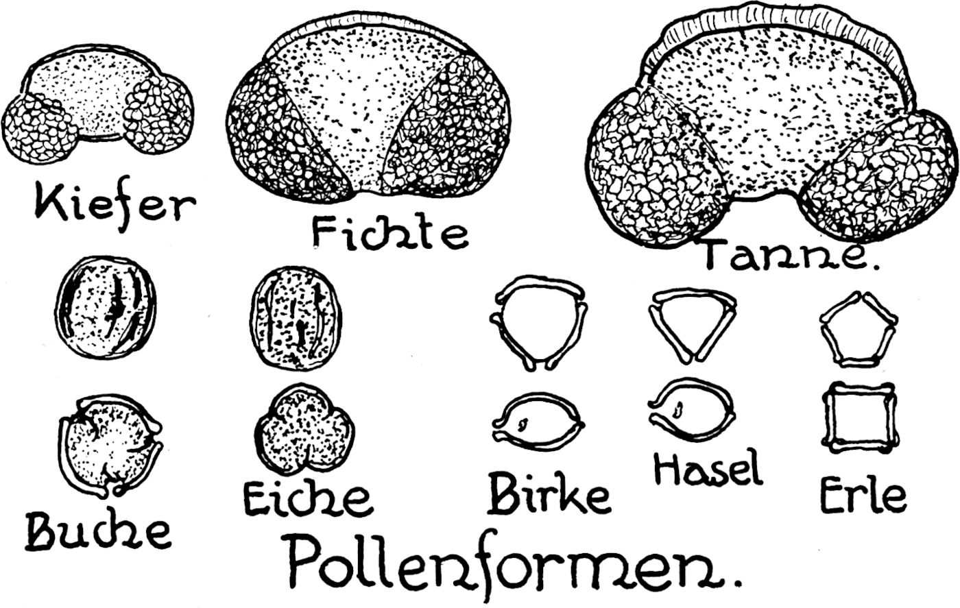 Nun wird in jedem Denkenden die Frage auftauchen, ob sich diese zarten und winzigen Gebilde in den vor Jahrtausenden gebildeten Moorschichten auch unversehrt oder wenigstens kenntlich erhalten haben, besonders wenn wir den Druck der Schichten und die Wirkung der Humussäuren in Betracht ziehen. Gewiß! Nicht alle Pollenarten sind uns überliefert, der Blütenstaub mancher Bäume, z. B. Ahorn und Pappel, ist unter solchen Bedingungen zugrunde gegangen. Aber bei den oben genannten Holzgewächsen ist die meist wunderbar ornamentierte wachsartige Außenhaut der Pollenzellen durch die Jahrtausende hindurch wohl erhalten geblieben. Zwar sind gegen den Pollen von heutzutage die Maße etwas zurückgeschwunden, aber Form und Ziselierung sind unversehrt. Wir werden also aus den Verhältniszahlen der in den Schichten befindlichen Pollenarten zueinander ein ungefähres Bild von der Waldbedeckung jener Zeit gewinnen können, während welcher jene Schichten entstanden.