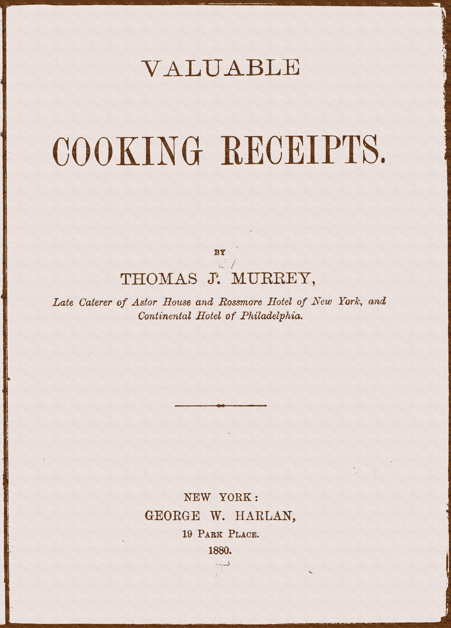 In issuing this little volume the publisher is aware that the market is already deluged with “cook-books,” both good and bad; but the aim in this instance is to utilize the experience of a caterer, who has spent twenty-five years of his life in the service of leading hotels and restaurants all over the country, besides catering to the appetites of thousands of private families. The well-known and unsurpassed cuisine of the hotels where he has been employed would of itself form testimony conclusive of his culinary ability, but he possesses besides numerous flattering letters from private parties, many of high standing in the community. As a salad-maker his reputation is wide-spread, and his receipts under this head are numbered among the hundreds, any one of which is a masterpiece of epicurean art and taste. It is my intention shortly to issue a book containing these receipts.