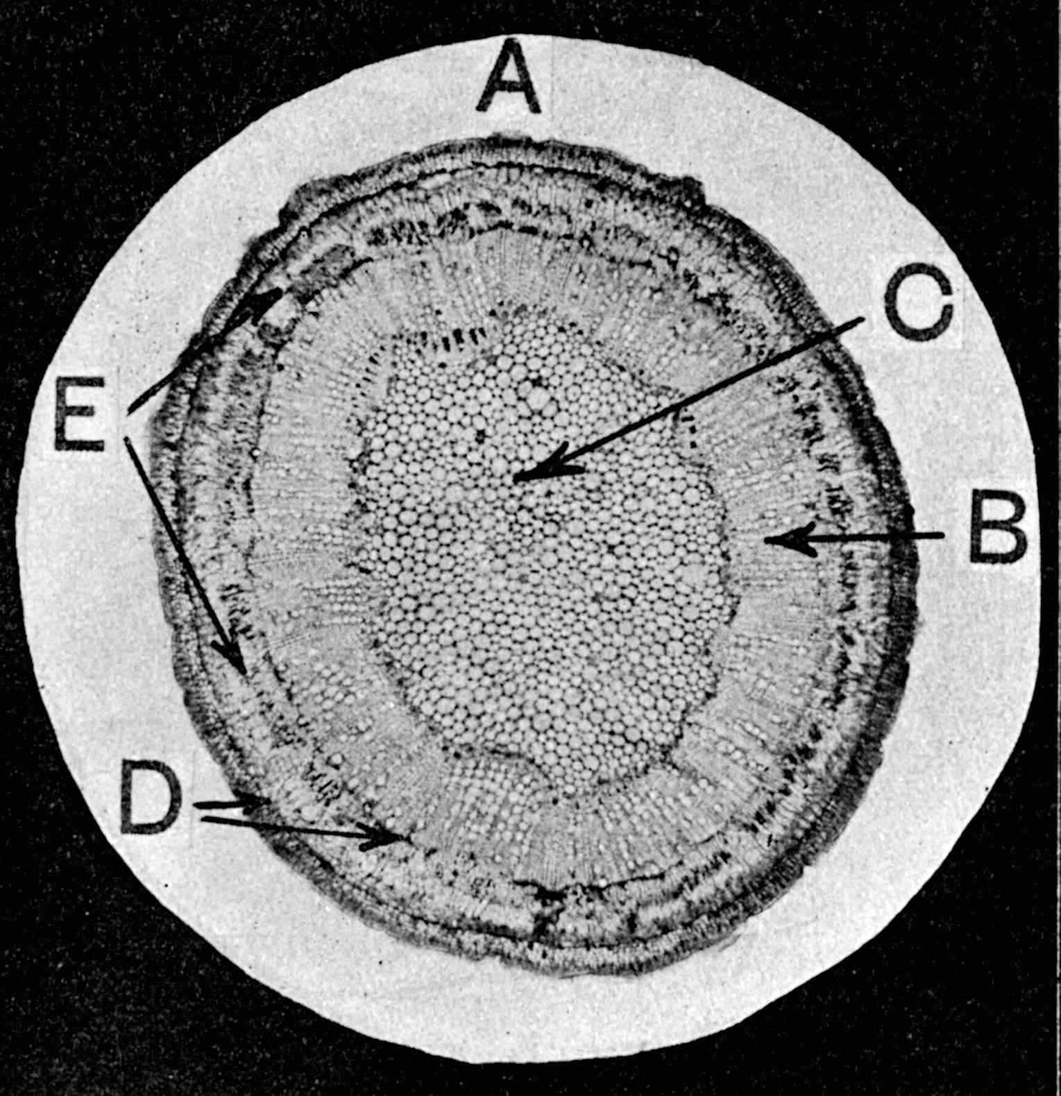 A thin cross-section cut from the stem of such a plant 14exhibits the characteristics in Fig. 7, in which A is the cuticle or outer bark, B is the woody part, and C the pith. The fibrous layer is between the two dark circles D, and a few groups of fibres in this layer are indicated by the letter E. Here, again, a considerable amount of extraneous matter must be separated from the bast layer, and when separated, the latter appears in the form of long ribbons. The cuticle and bast layer were originally stripped from the plants; the former were then placed in the mouth so that the saliva could aid in the separation of the fibres from the bark, and permit of a finer reduction of the fibrous layer to produce finer threads. And although at the present time this method is practised for thread making in many primitive communities, it need hardly be said that much more efficient methods have long been practised for commercial 15purposes, such methods being known by the technical terms “retting,” “breaking,” and “scutching.”