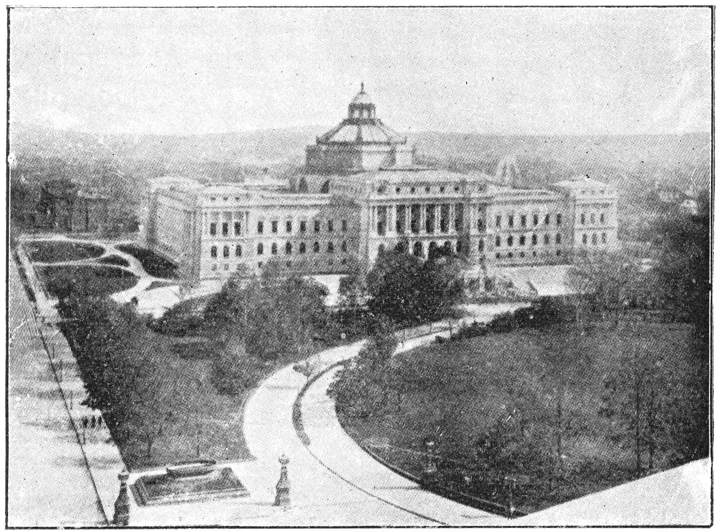 I kapitoliets grannskap befinner sig äfven det ryktbara kongressbiblioteket eller som det med sitt officiella namn heter »Library of Congress». Tomten oberäknad, och naturligtvis ej heller de dyrbara samlingarna, har denna byggnad kostat staten mer än 20 millioner kronor, en enorm summa, men så är också denna institution något ensamt i sitt slag. Dess yttre arkitektur påminner visserligen i mångt och mycket om vissa officiella s. k. praktbyggnader vid »Ringen» i Wien eller i Berlin, särskildt om det nya riksdagshuset i den sistnämnda staden, och gör ej något vidare tilltalande intryck; det inre däremot med sin ståtliga i hvit marmor, förgyllningar och delvis präktiga dekorativa målningar utstyrda vestibul verkar onekligen imponerande, äfven om man skulle tycka, att det är alltför pråligt för en den lärda verldens helgedom. Den stora läsesalen, uteslutande utförd i läcker gulbrun Siena-marmor, nästan utan förgyllningar samt med allt trävirke af mörkbetsad mahogny, är utan gensägelse ett af de noblaste och smakfullaste rum man kan få se.